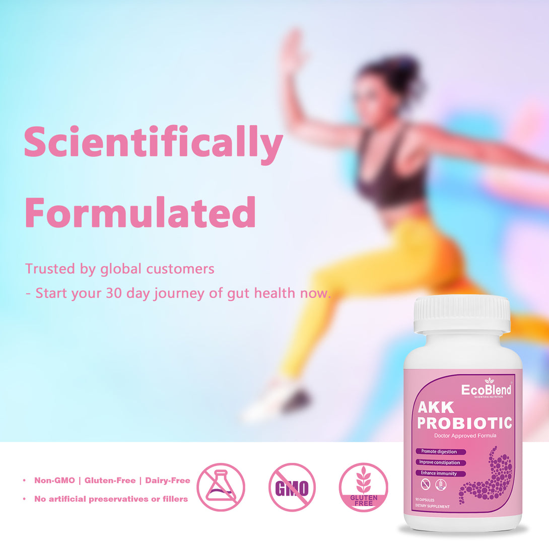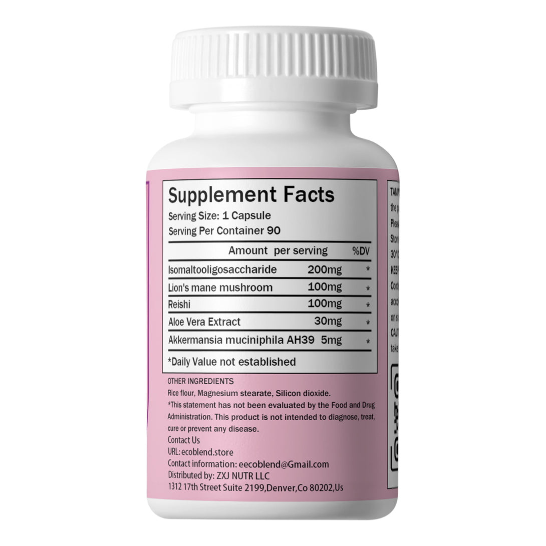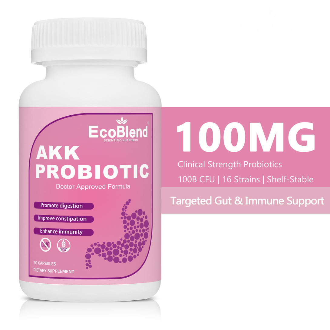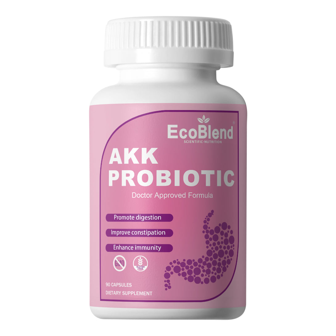 EcoBlend AKK Bacteria AH39 Probiotic Capsules offer 8 billion CFUs and 4 unique strains per capsule. They provide a balanced microbiota to support women's health. Contains 100 mg of probiotics and cranberry extract. Formulated for adult women, it includes organic ingredients like vitamin D, berberine, cranberry extract, xylo-oligosaccharides (XOS), and a blend of probiotics.